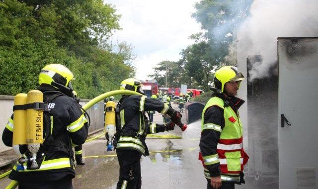 Inzwischen loderten bereits Flammen aus dem Elektro-Verteilerkasten. Mit gezielten Wasserstößen konnten zwei Atemschutztrupps das Feuer rasch unter Kontrolle bringen und so einen größeren Schaden durch ein Übergreifen auf das Gebäude verhindern.